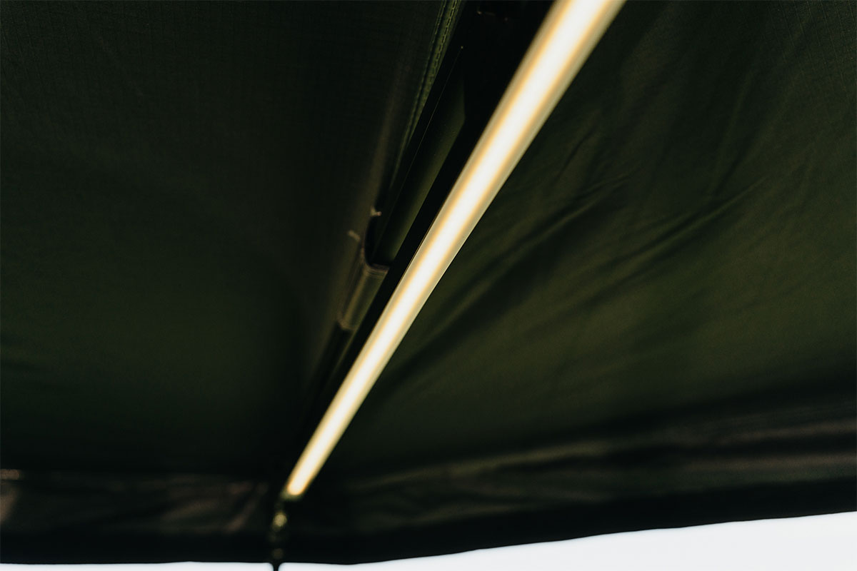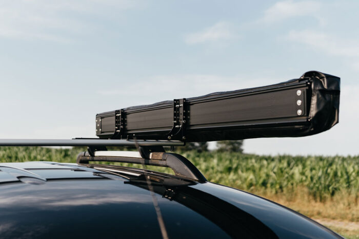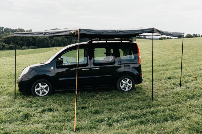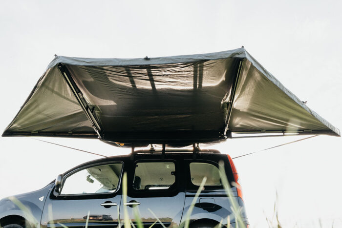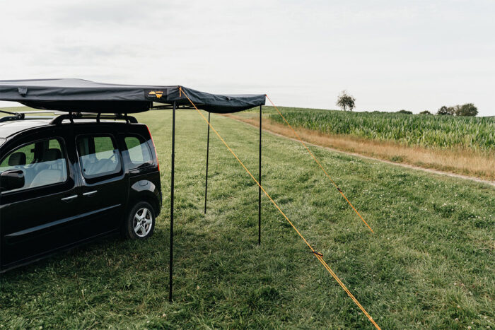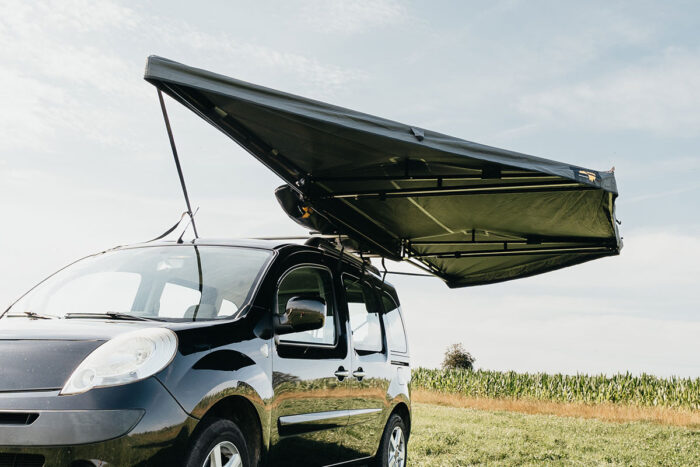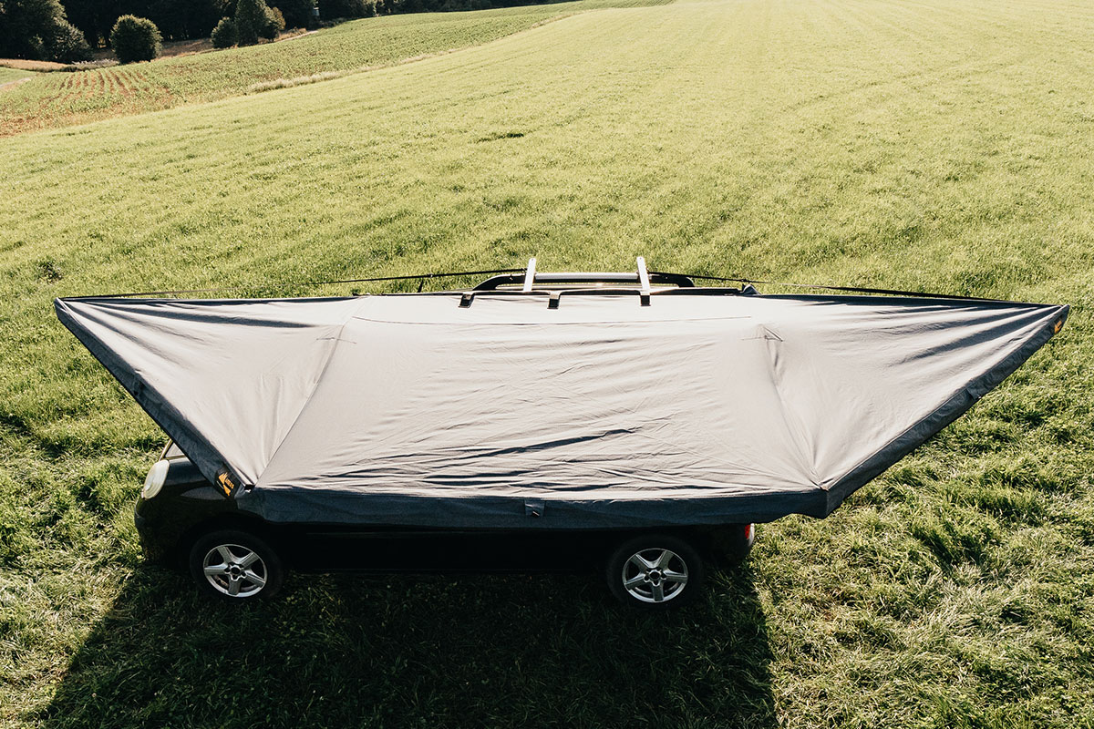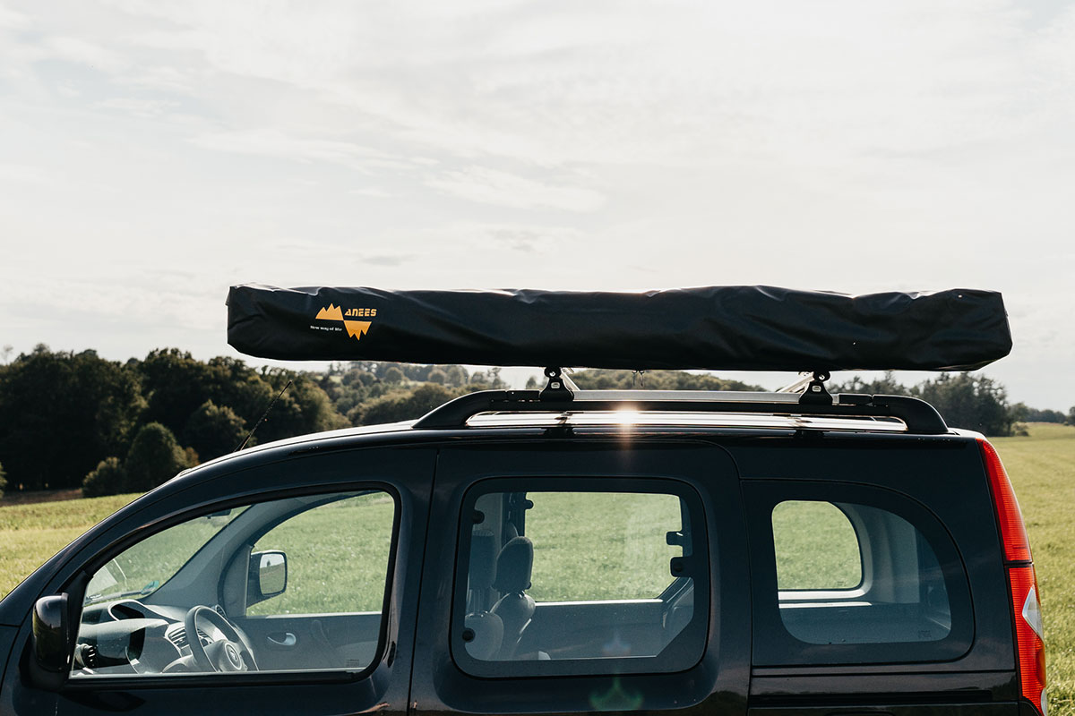Die ANEES Fahrzeug Markise ist speziell für die Montage am Autodach konzipiert. Mit ihrer beeindruckenden, freitragenden 180-Grad-Abdeckung schafft sie eine großzügige, geschützte Fläche. die es ermöglicht, sich auch bei intensiver Sonneneinstrahlung oder unerwartetem Regen wohlzufühlen. Die separat erhältliche Seitenwand der ANEES Markise 180 Grad lässt sich zu allen Seiten schließen.