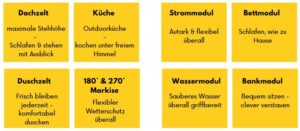 Erweitern Sie ihren D´ Camper stufenweise zum vollausgestatteten Outdoor-Begleiter mit bis zu vier Schlafplätzen. Folgende Module stehen zur Auswahl, sie finden diese unter der Zusatzausstattung. Fügen sie ihre Auswahl einfach dem Basismodell hinzu: