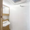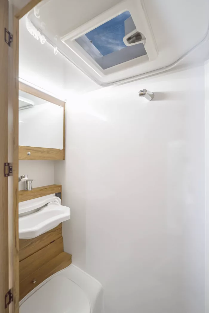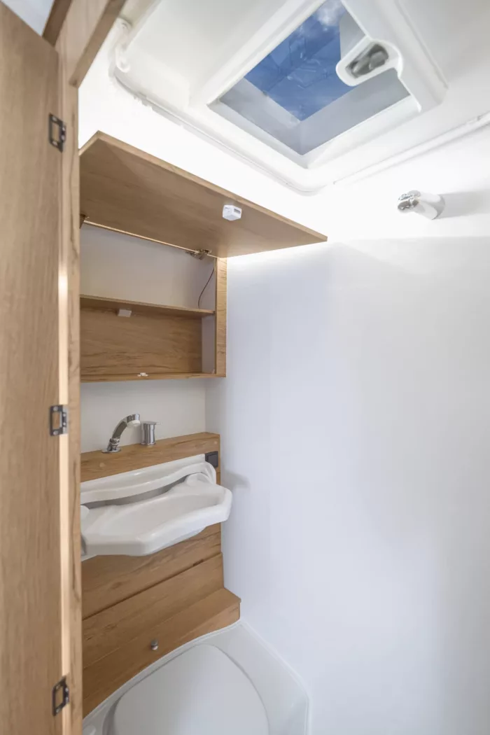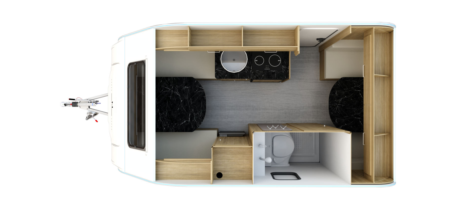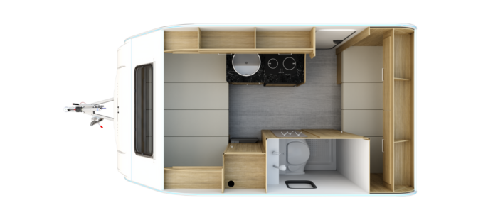 Das moderne Design und die ausgesprochen gute Platzeinteilung des Wohnwagen Lazur 3 bieten ausreichend Platz für eine 3-köpfige Familie. Im Wohnbereich des Wohnwagens befinden sich 2 Sitzgruppen, die kinderleicht zu bequemen Schlafplätzen umgebaut werden können. Weiteren Komfort bietet die Nasszelle im Caravan. Diese verfügt über eine Thetford Toilette mit Außenentleerung, eine Dusche mit Warmwasser-Elektro-Boiler TT2, einen kleinen Kosmetikspiegel und ein kleines Klappwaschbecken. Der eingebauten Frischwassertank von ca. 30 Liter kann von außen befüllt werden.