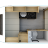 Die kleine Bordküche ist mit Markengeräten von Dometic ausgestattet. Der 2-flammige Gasherd, Kühlschrank inklusive Eisfach und die Spüle bieten ausreichend Komfort beim Kochen.