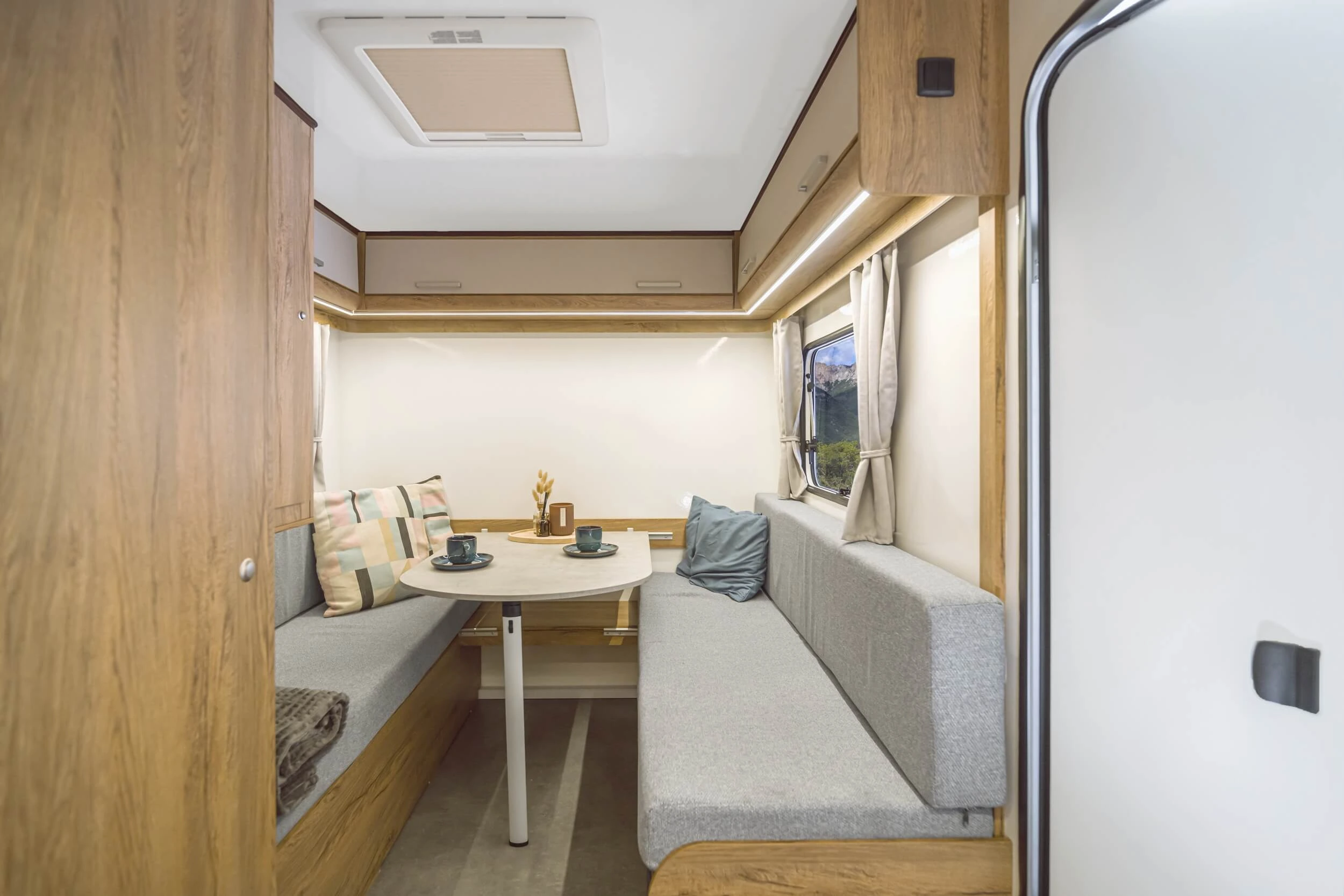 Um mehr Licht im Wohnwagen und ausreichend Belüftung an heißen Tagen zu erhalten, wurde ein Dachfenster mit Verdunkelungs- und Moskitorollo verbaut. Die Doppelrollos für die Seitenfenster oder das Moskitorollo für die Eingangstür sind separat zu bestellen.