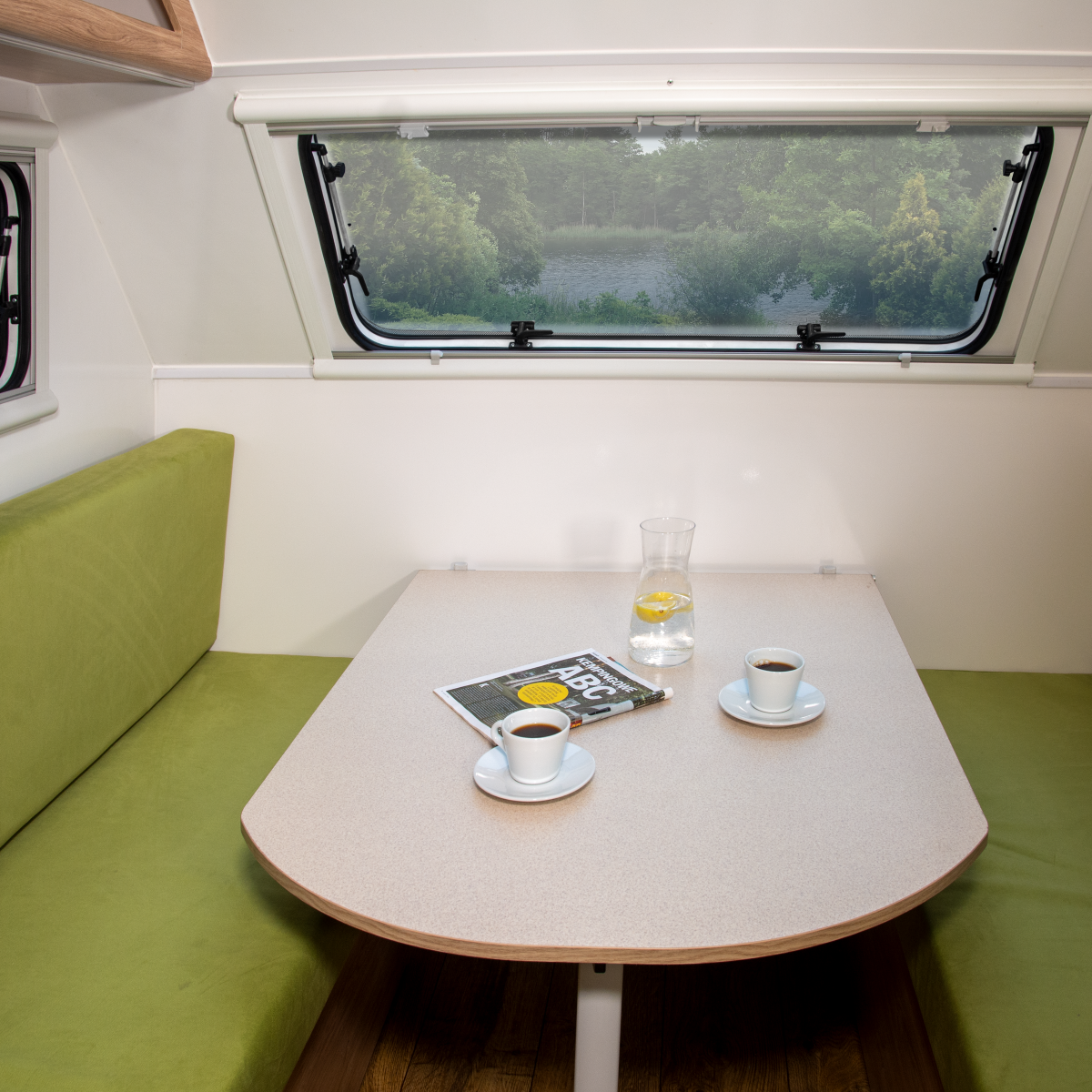 Im Wohnbereich des N-Cross 4 Family befindet sich eine Sitzgruppe für 4 Personen, die mit wenigen Handgriffen zu einem Doppelbett mit einer Liegefläche von 205x130 cm umgebaut werden, kann. Im Heck des Anhängers befindet sich ein Etagenbett mit den Maßen 63×199 cm (max. Belastung von 70 kg). Die verschiedenen hochwertigen Stoffmuster verleihen dem Wohnwagen einen persönlichen Stil.