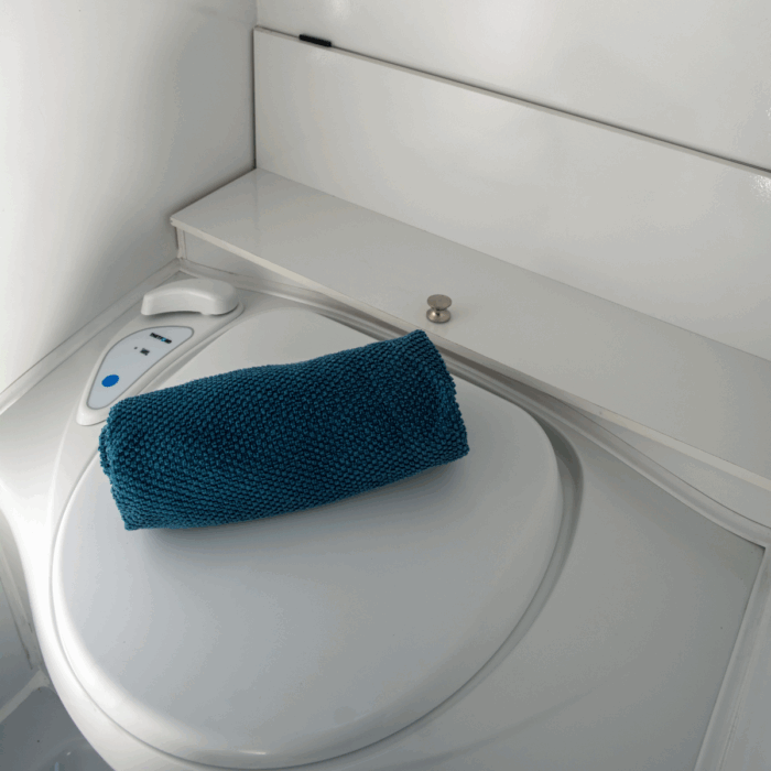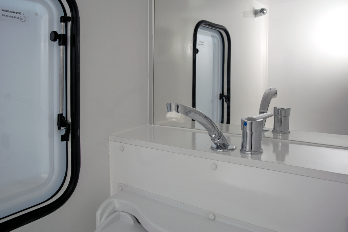 Der Caravan ist mit einer Kassetten - Toilette mit Außenentleerung, einer Dusche und einem kleinen Waschbecken ausgestattet. Um beim Warmwasser autark zu sein, ist es möglich, das Truma Combi System G+ E (Gas+ Elektro) Duschinstallation optional zu erweitern.