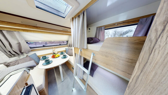Erlebt jetzt den New Sport 4 mit Etagenbett, Sitzgruppe, sowie Badezimmer mit Dusche und Toilette