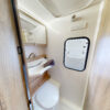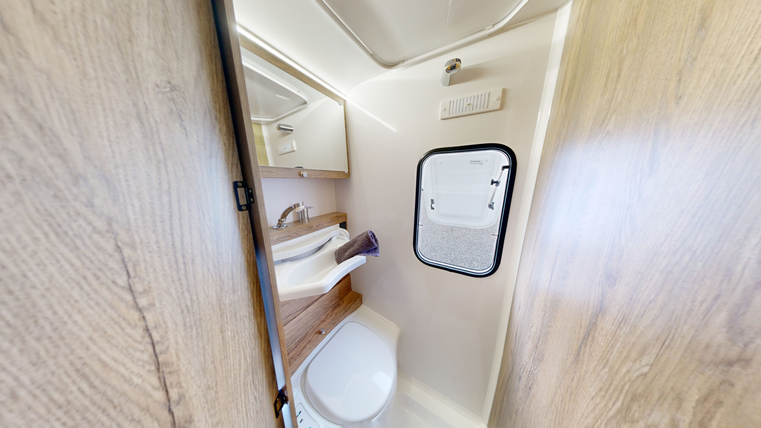 Die Nasszelle ist mit einer Toilettenkassette, welche von außen zugänglich ist, einer Dusche, einem kleinen Klappwaschbecken und einem Spiegel ausgestattet.