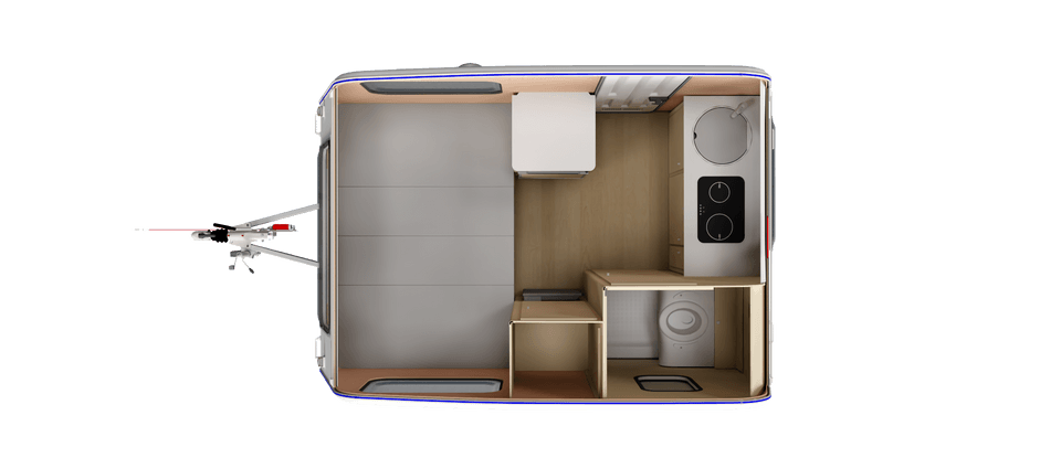Der Kleinwohnwagen verfügt über eine serienmäßige Küchenzeile mit Dometic Geräten und einer Sitzgruppe für 4 Personen, die einfach zu einem gemütlichen Schlafplatz für 2 Personen umgebaut werden kann. Das Highlight des Anhängers ist die gut bewährte Thetford Kassettentoilette, welche von außen entleert werden kann.