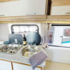 Zur Serienausstattung des Wohnwagens gehört eine Küchenzeile, welche sich gegenüber der Eingangstür befindet. Sie ist mit der Kombinationskochmulde von DOMETIC ausgestattet - diese beinhaltet eine 2-flammige Gas-Kochmulde und Spüle mit einer temperaturbeständigen Sicherheitsglas- Abdeckung. Sie ist platzsparend und bietet ausreichend Komfort beim Kochen am Campingplatz.
