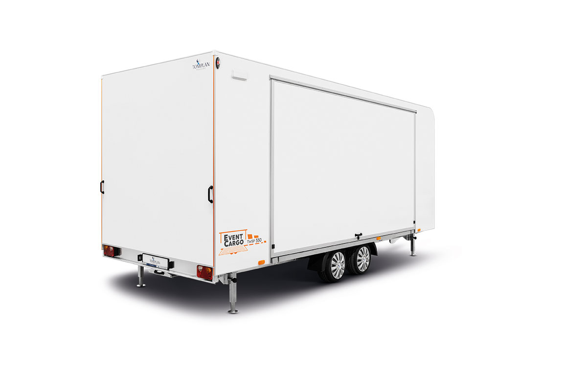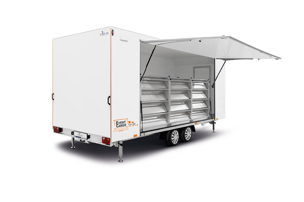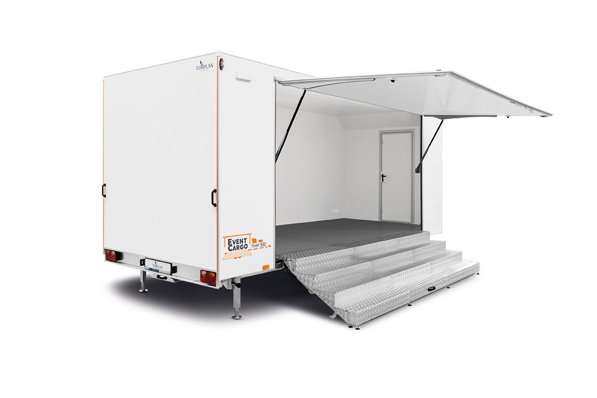 Der Präsentationsanhänger TWSP 550T03 aus der Event Cargo-Reihe von Tomplan bietet mit seiner Klapptreppe optimalen Komfort. Die geöffnete Klappe bietet Schutz vor Sonne und regennassem Wetter.